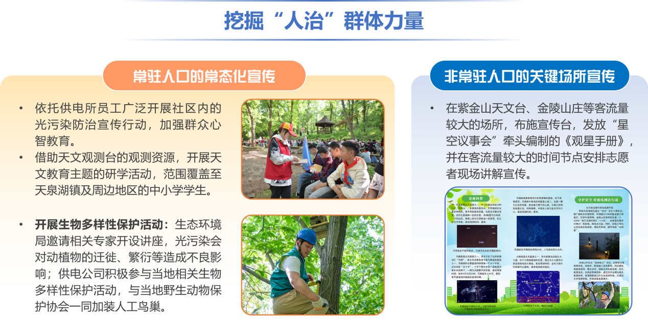 为了解决光污染治理“不想管”的问题,在做好全类型光源管控的“技防”基础上,供电公司还联合各利益相关方深入探索“人治”的可能性。