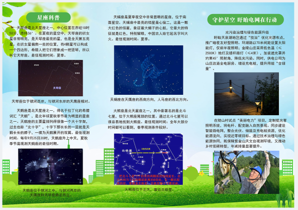针对不同人群开展宣传教育,唱响“亚洲最美星空”品牌。(1)针对社区百姓和特殊的学生群体等常驻人口开展常态化教育宣传活动,依托“星空议事会”品牌,在宣贯中植入光污染治理良性循环模式,将光污染治理深入人心,利用群众力量可在一定程度上减少光污染发生频率。(2)针对往来游客等非常驻人口开展关键场所的宣传教育,依托“星空议事会”平台,供电公司在天文爱好者协会的指导下编制《观星手册》。在紫金山天文观测台、金陵山庄等客流量较大的场所,布施宣传台,并在星空节等关键节点安排志愿者进行现场科普讲解《观星手册》,共计发放300余份手册。