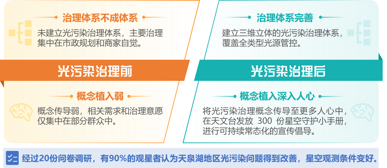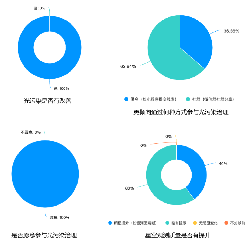 根据问卷结果,有63.6%的受访者表示更愿意选择社群治理的方式,100%的受访者表示愿意成为光污染治理的一员。经过持续的光污染治理,在半年后的二次问卷中,有90%的受访者认为天泉湖地区的光污染有所改善,其中有40%的受访者认为星空裸眼观测质量得到明显提升。