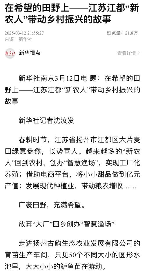 春耕时节,江苏省扬州市江都区大片麦田绿意盎然,长势喜人。越来越多的“新农人”回到农村,创办“智慧渔场”,实现工厂化养殖;借助电商平台,将小小甜品做到亿元产值;发展现代种植业,带动粮农增收……