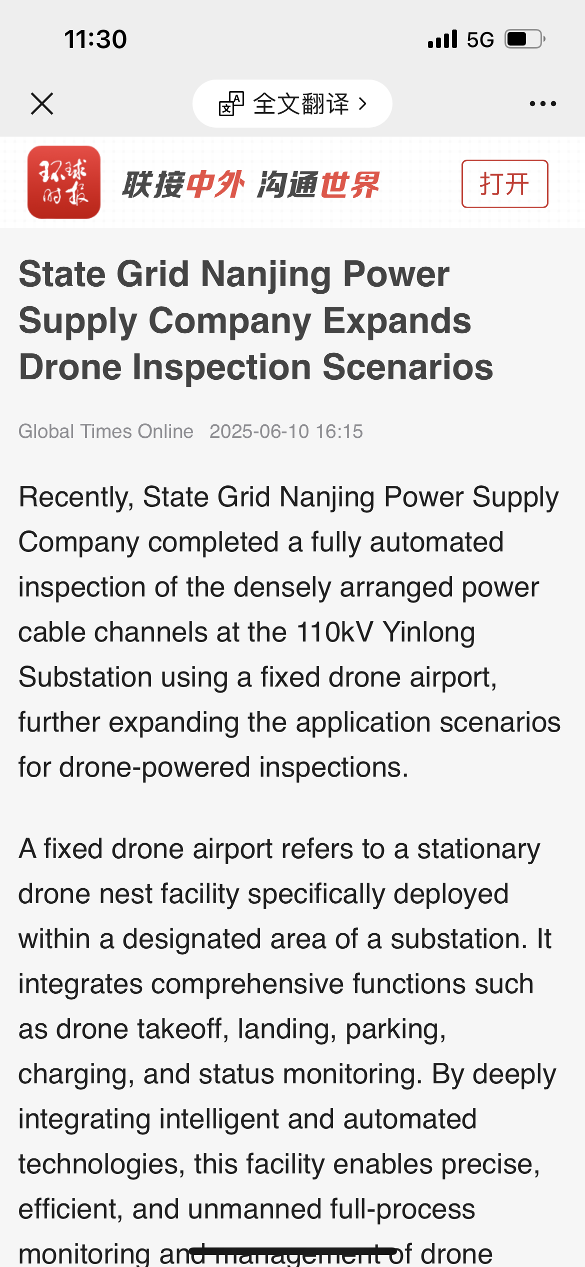During this inspection, the drone operation center of State Grid Nanjing Power Supply Company issued instructions to the fixed airport inside the Yinlong Substation, located 20 kilometers away. The drone then flew along the preset path to check for potential external damage risks above the densely packed corridors and whether relevant markings were clear. The time required for a single inspection was reduced from the previous 2 to 3 hours using manual methods to just 16 minutes.