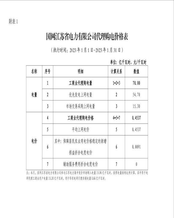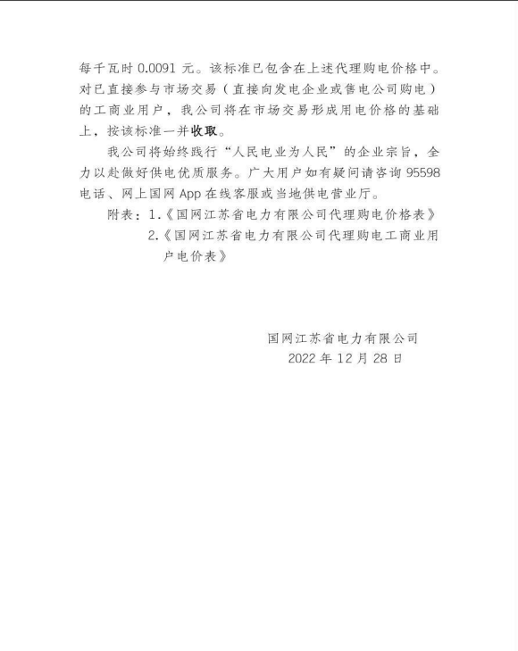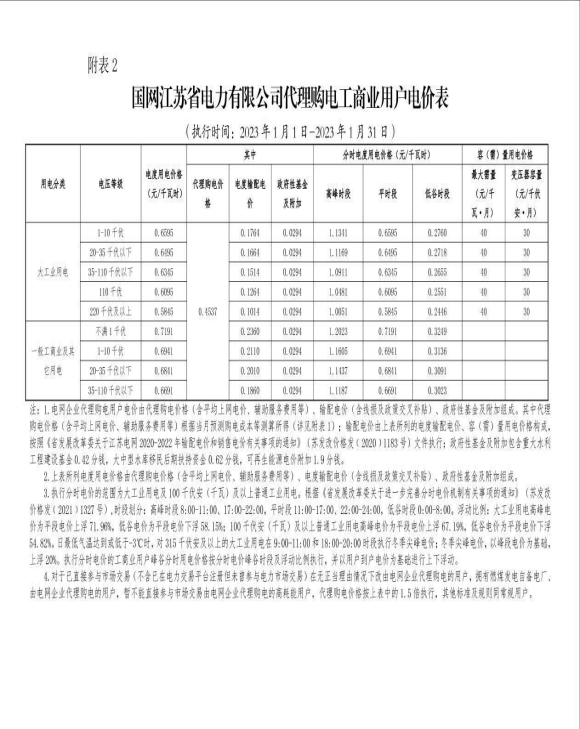 国网江苏省电力有限公司关于2023年1月代理购电工商业用户电价的公告
