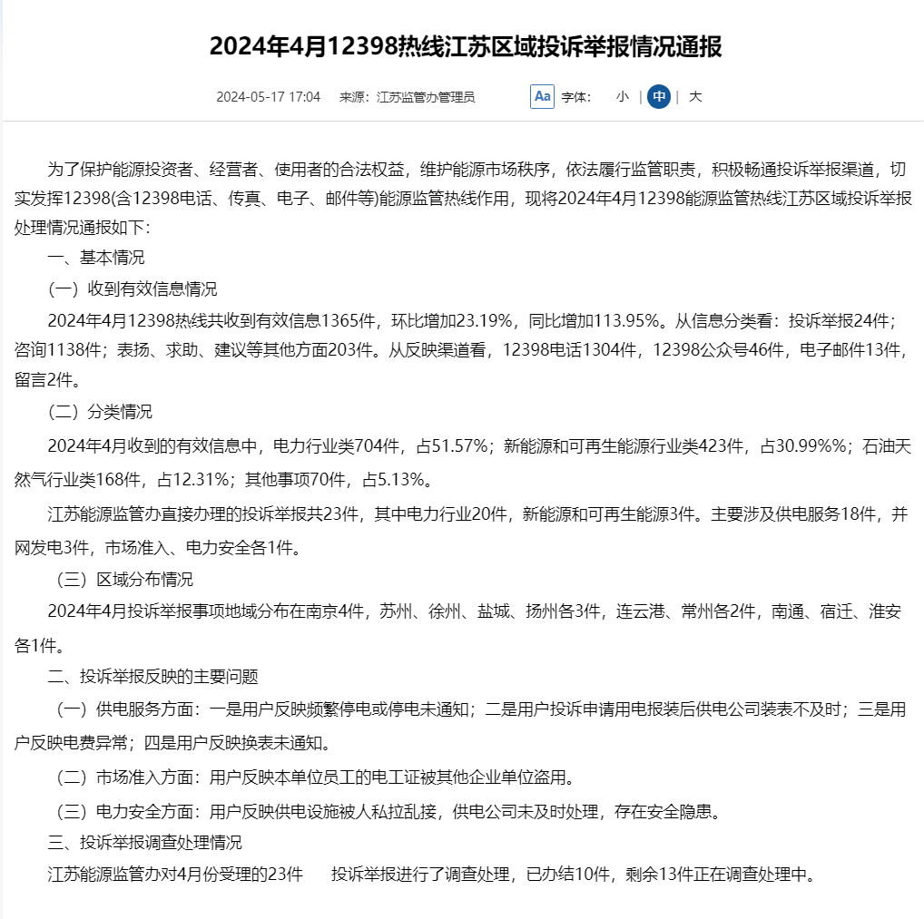 2024年4月12398热线江苏区域投诉举报情况通报