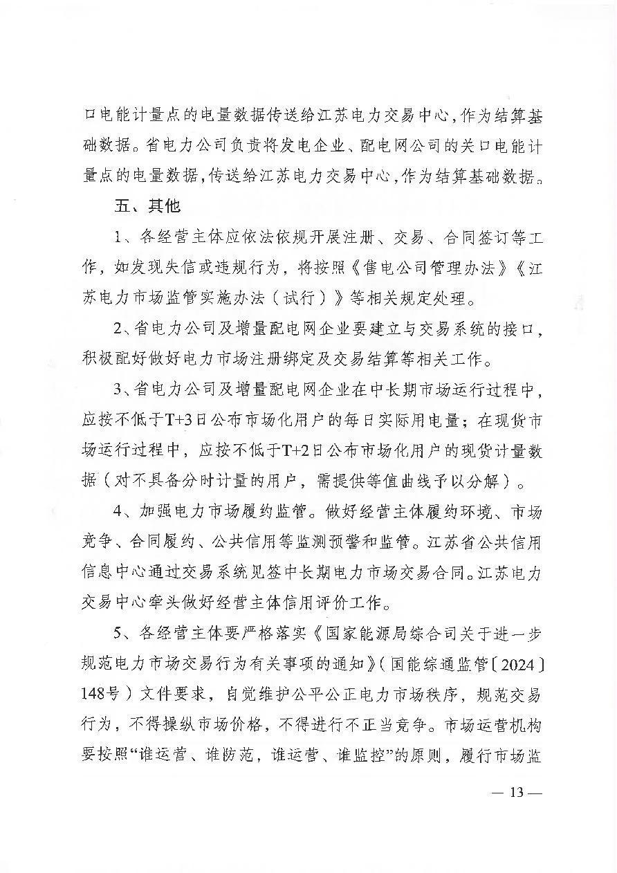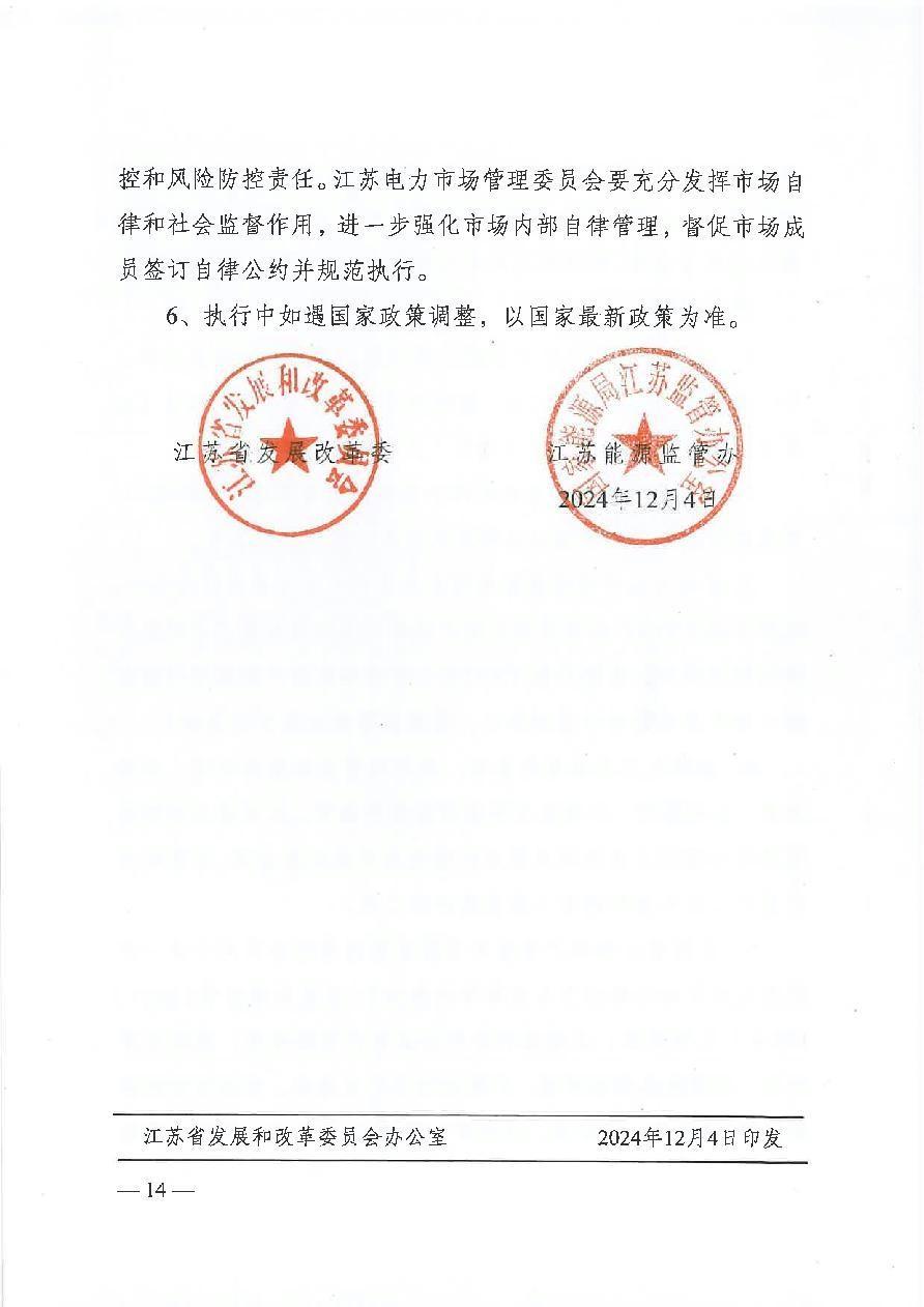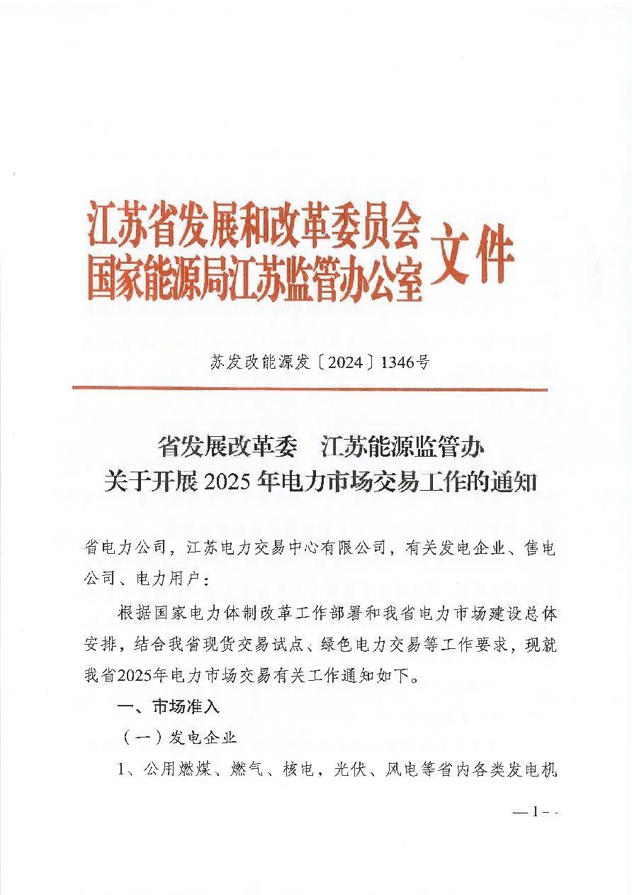 苏发改能源发【2024】1346号 省发展改革委 江苏能源监管办关于开展2025年电力市场交易工作的通知
