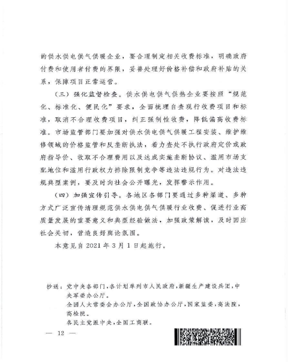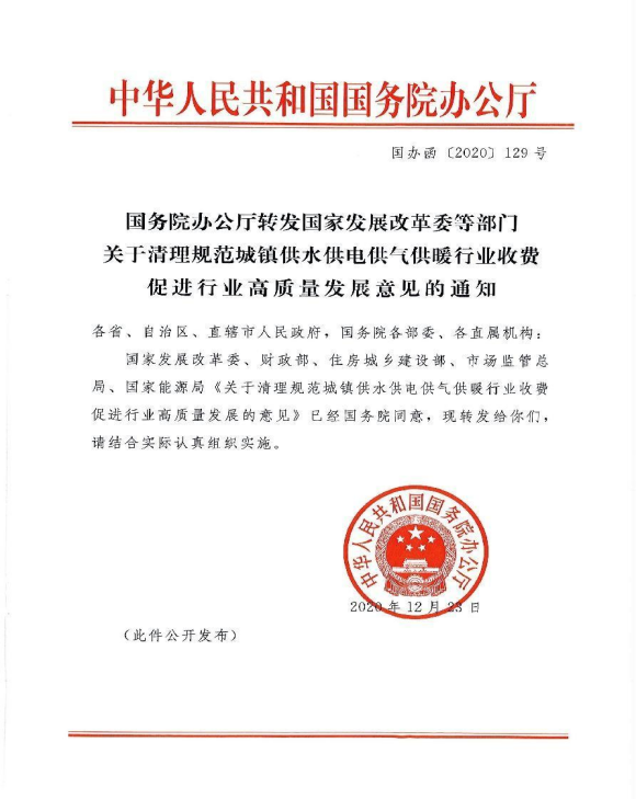国务院办公厅转发国家发展改革委等部门关于清理规范城镇供水供电供气供暖行业收费促进行业高质量发展意见的通知 国办函〔2020〕129号