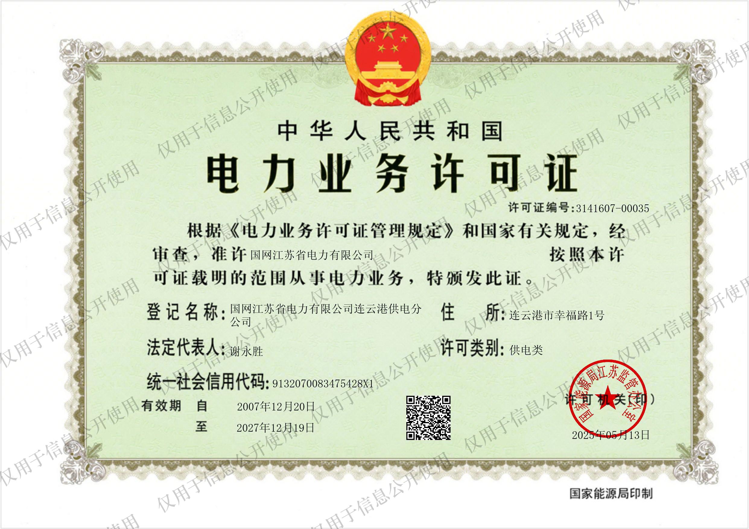 国网江苏省电力有限公司连云港供电分公司电力业务许可证