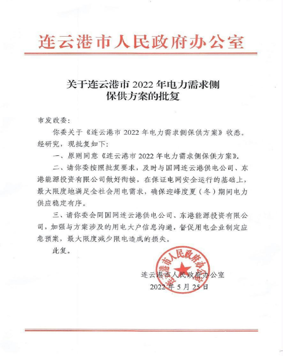 连云港市2022年电力需求侧保供方案的批复