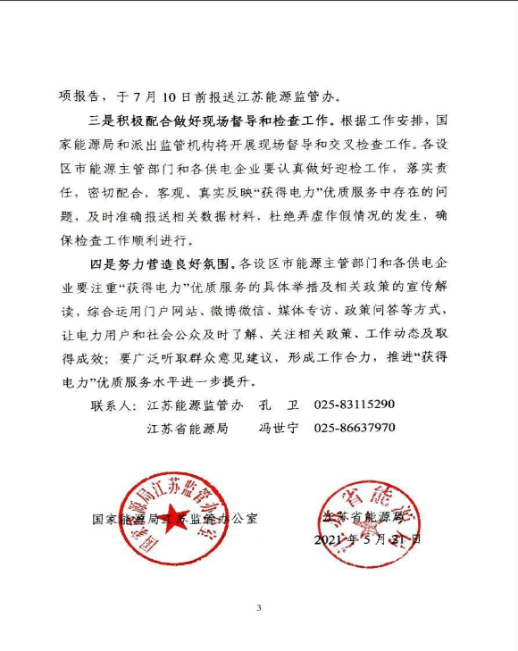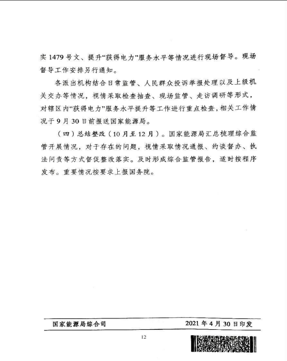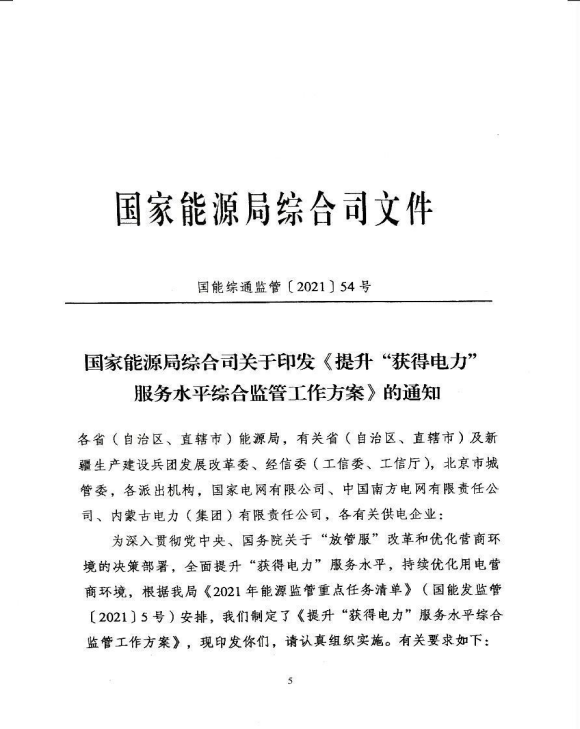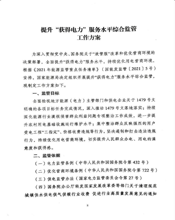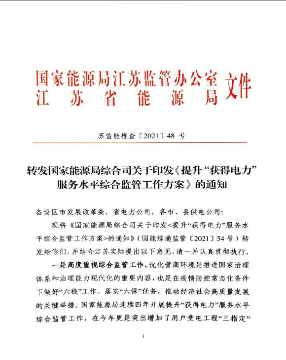 苏监能稽查〔2021〕48号 转发国家能源局综合司关于印发《提升“获得电力”服务水平综合监管工作方案》的通知