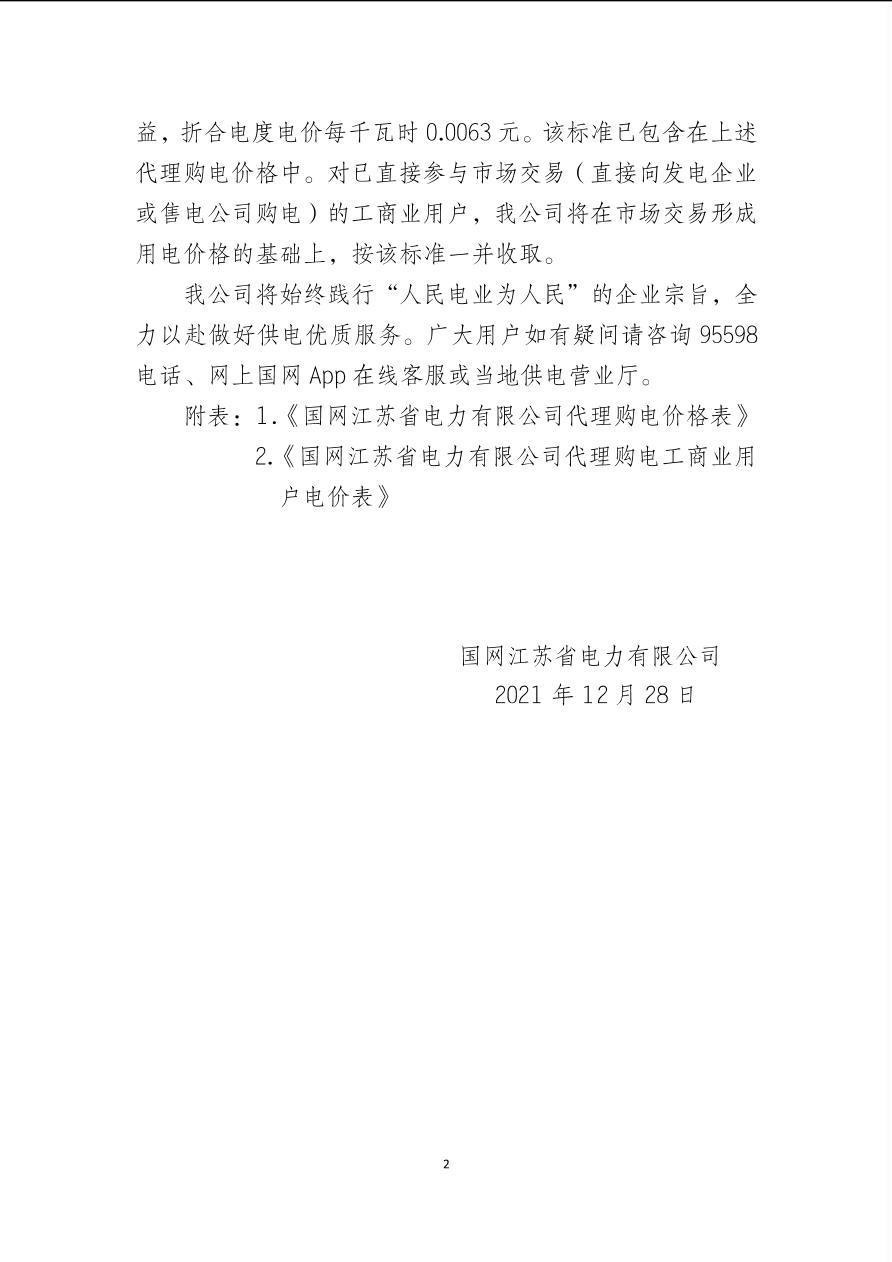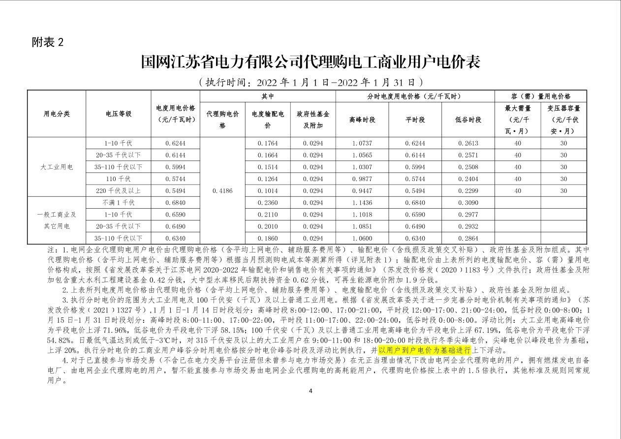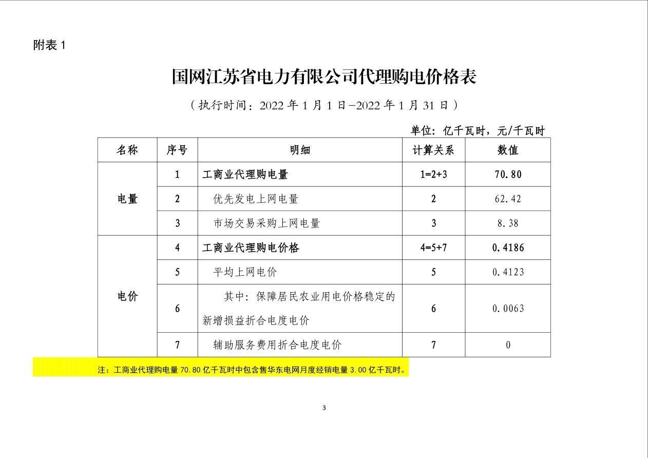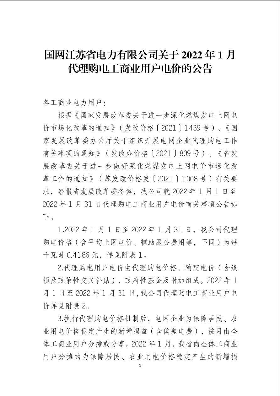 国网江苏省电力有限公司关于2022年1月代理购电工商业用户电价的公告