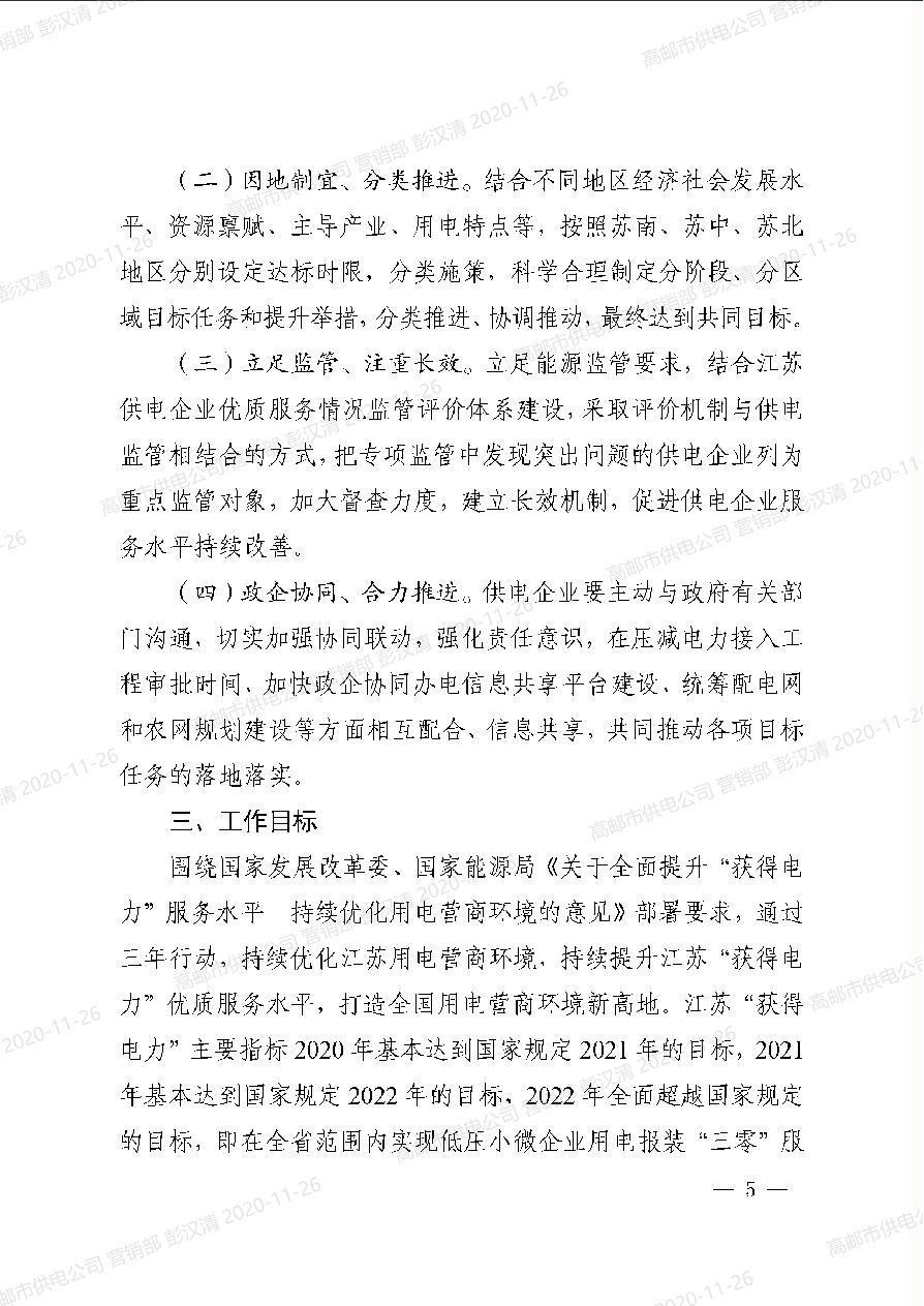 关于印发《江苏能源监管办全面提升“获得电力”服务水平持续优化用电营商环境三年(2020-2022年)行动方案》的通知(苏监能稽查[2020]115号)