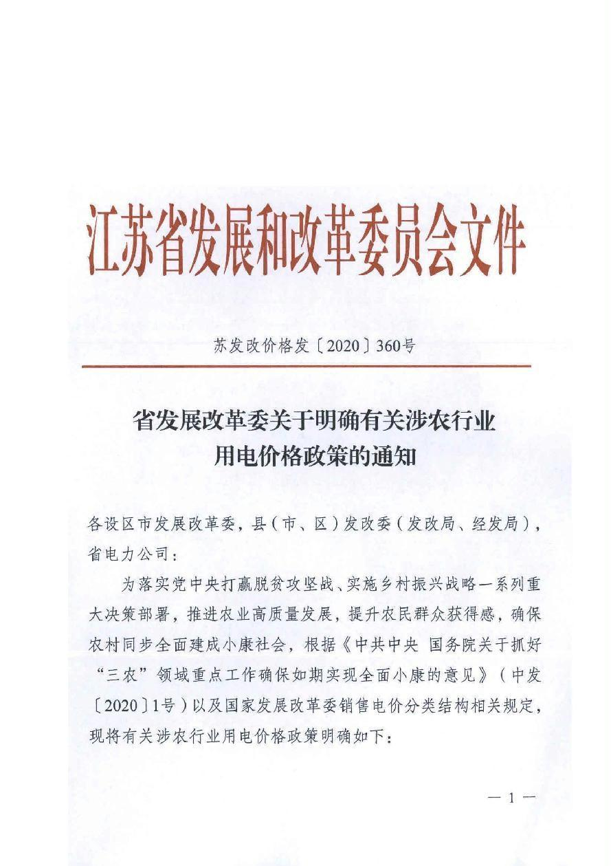 省发展改革委关于明确有关涉农行业用电价格政策的通知(苏发改价格发〔2020〕360号)