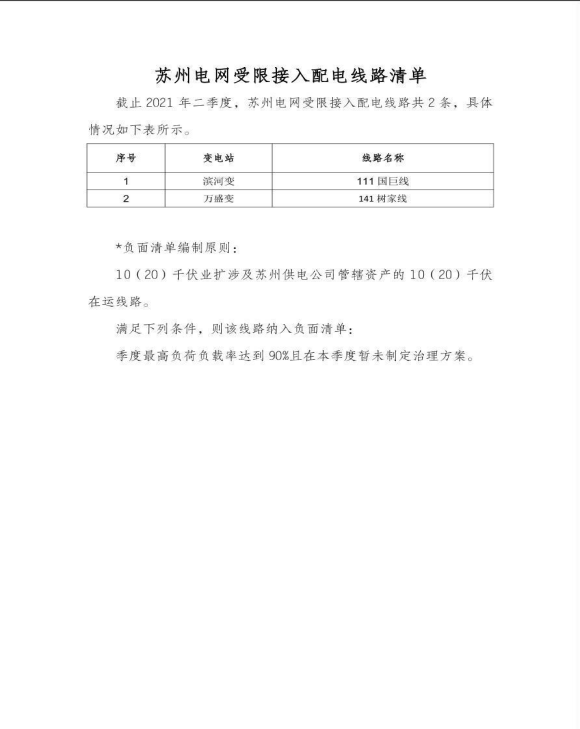 苏州供电公司电网接入受限清单(2021年二季度)