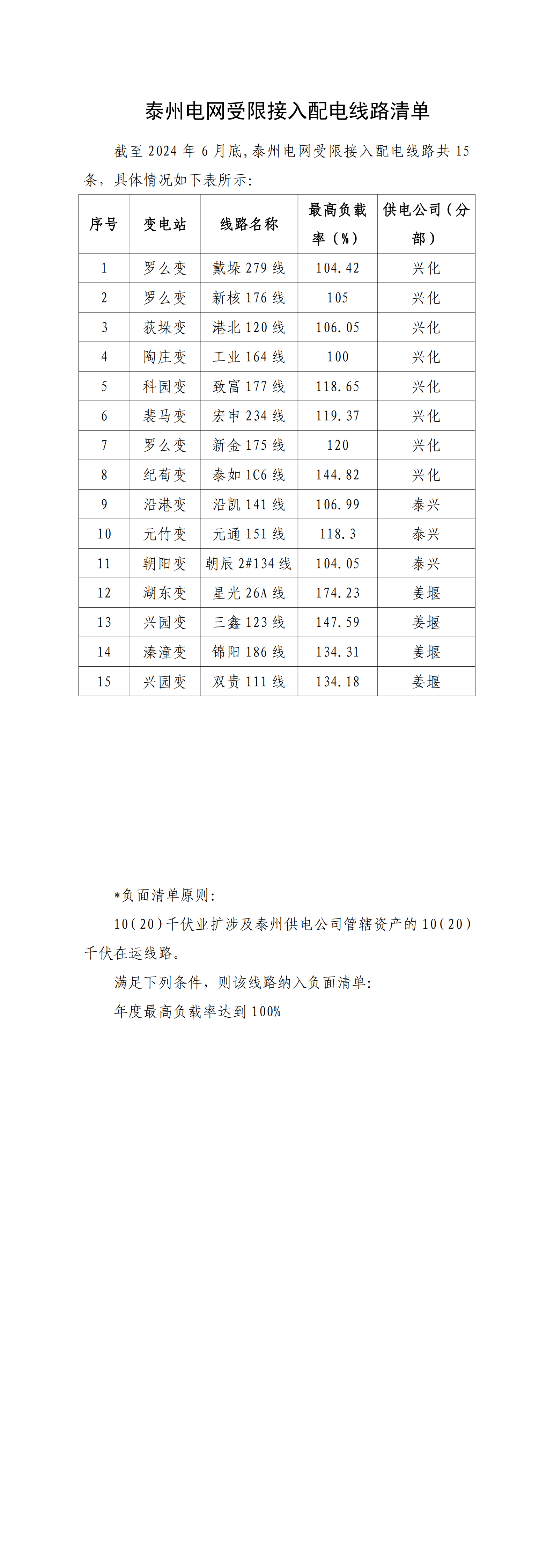 泰州电网2024年第三季度受限接入配电线路清单