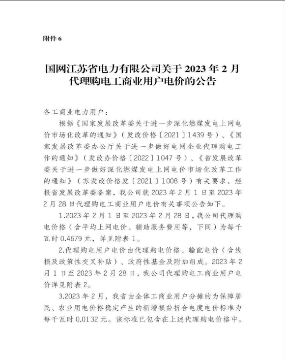 国网江苏省电力有限公司关于2023年2月代理购电工商业用户电价的公告