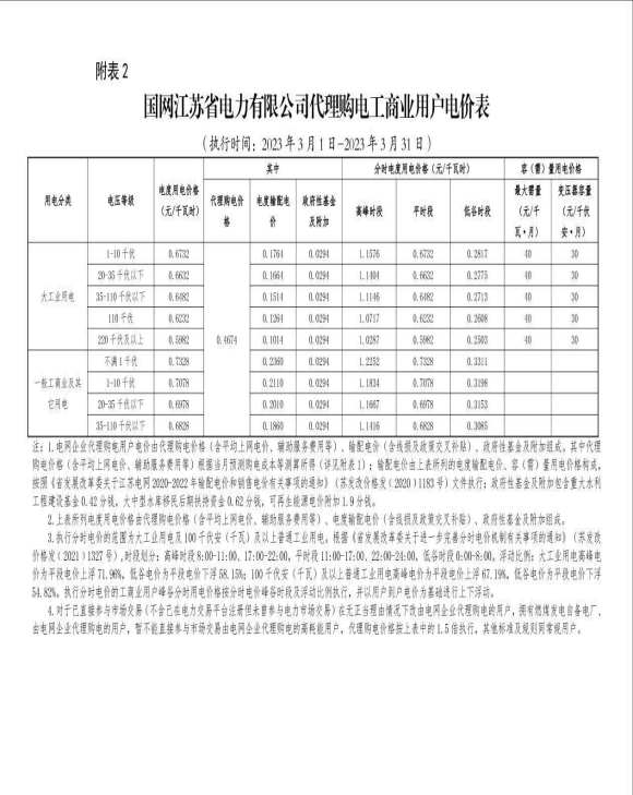 国网江苏省电力有限公司关于2023年3月代理购电工商业用户电价的公告