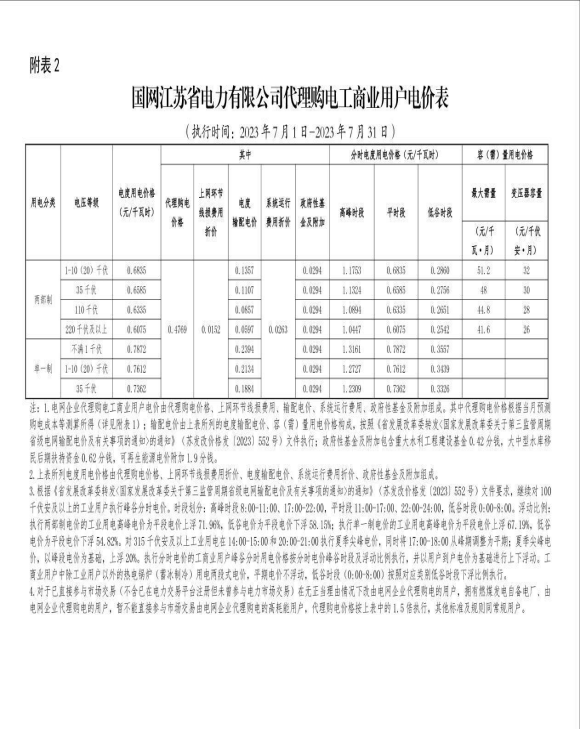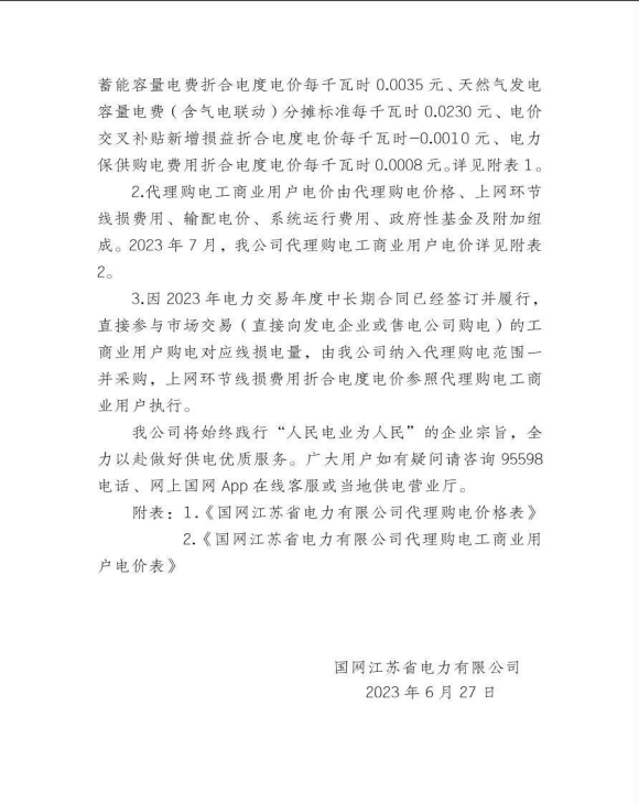 国网江苏省电力有限公司关于2023年7月代理购电工商业用户电价的公告