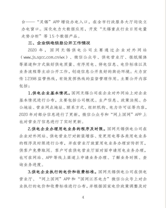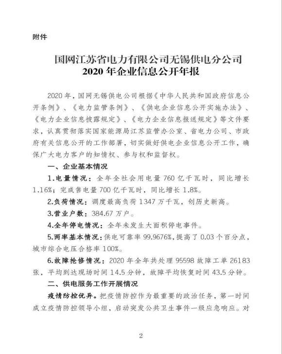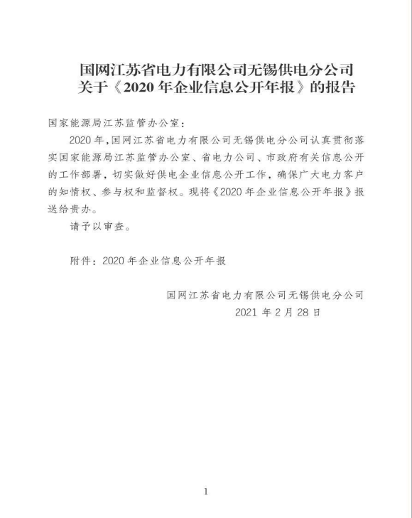 国网江苏省电力有限公司无锡供电分公司关于《2020年企业信息公开年报》的报告
