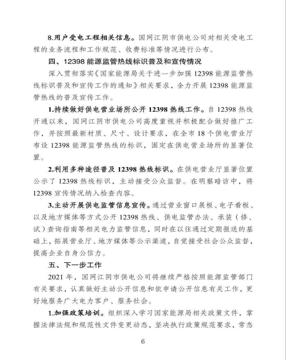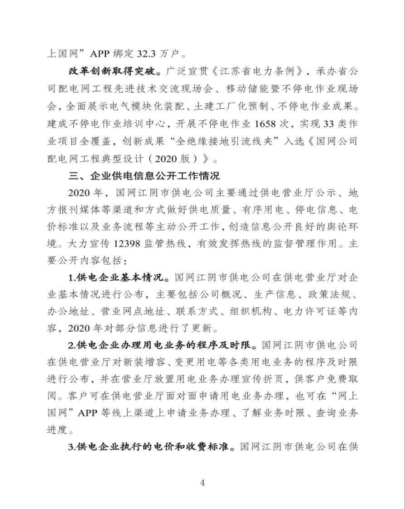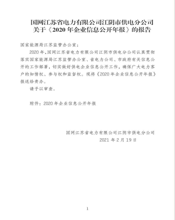 国网江苏省电力有限公司江阴市供电分公司关于《2020年企业信息公开年报》的报告