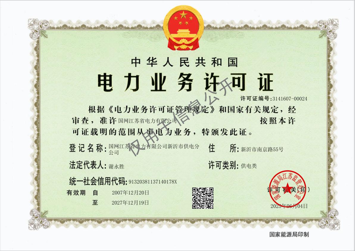 国网江苏省电力有限公司新沂市供电分公司电力业务许可证