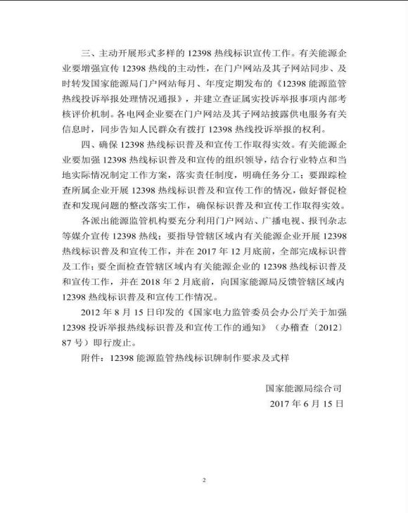 国家能源局综合司关于进一步加强12398能源监管热线标识普及和宣传工作的通知(国能综通监管〔2017〕43号