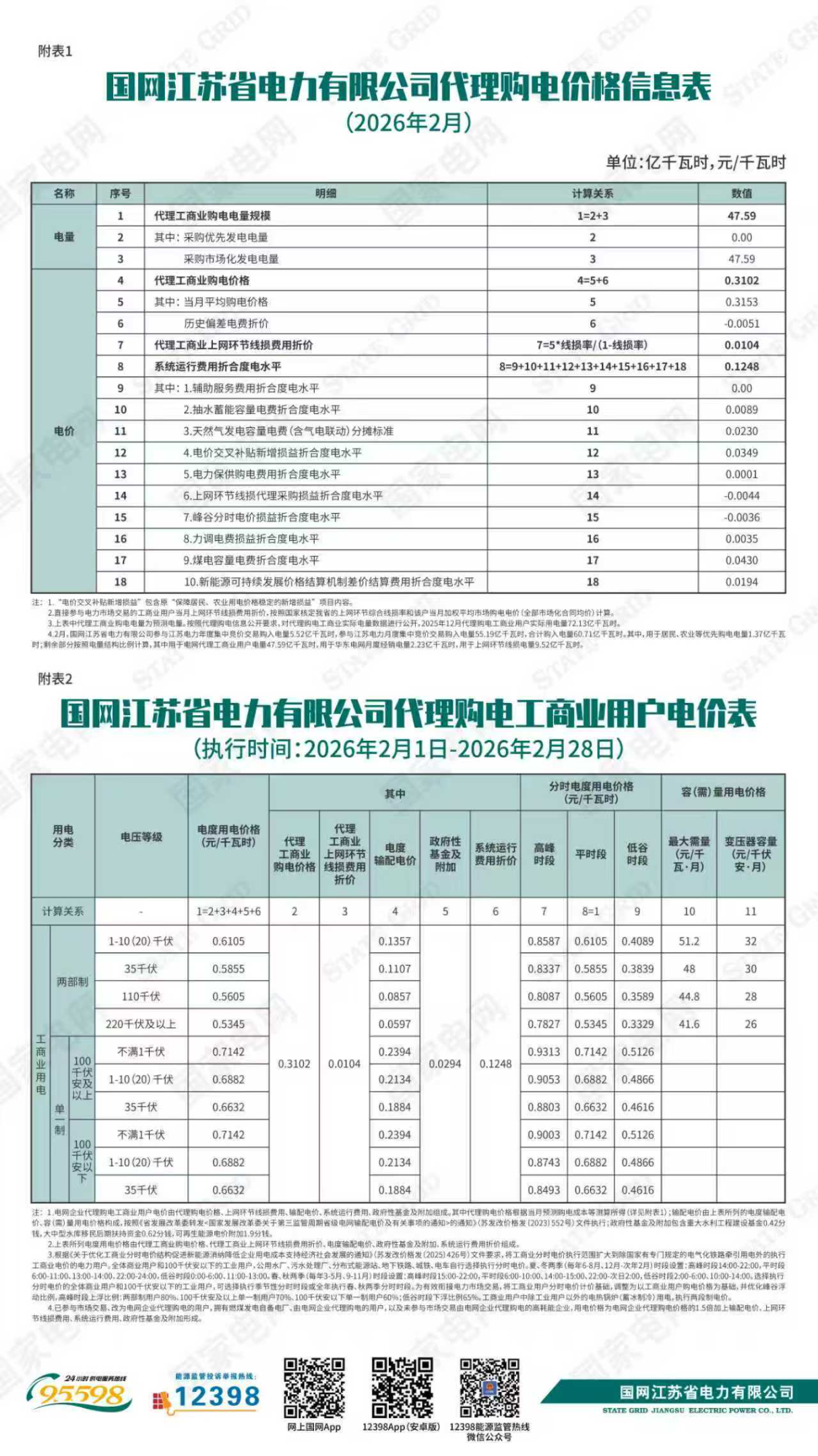 国网江苏省电力有限公司关于2026年2月代理购电工商业用户电价的公告