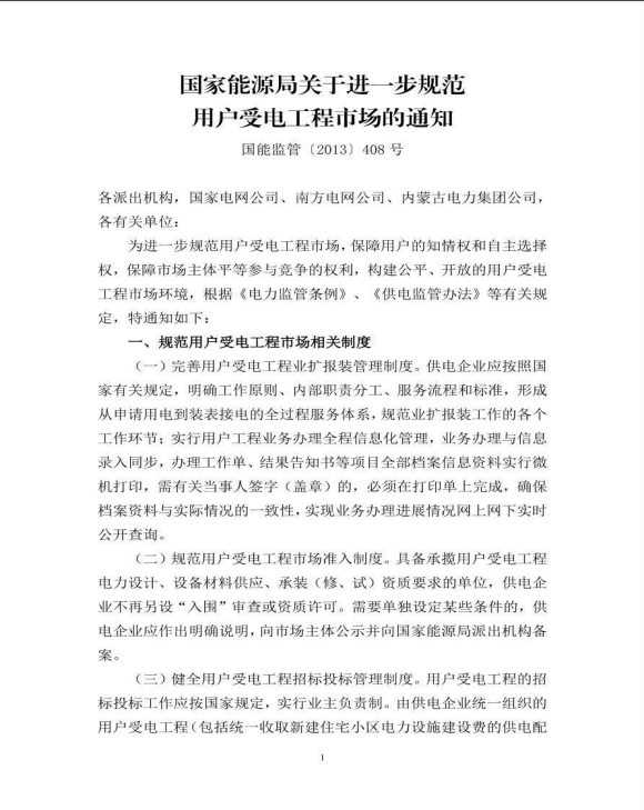 国家能源局关于进一步规范用户受电工程市场的通知(国能监管〔2013〕408号)