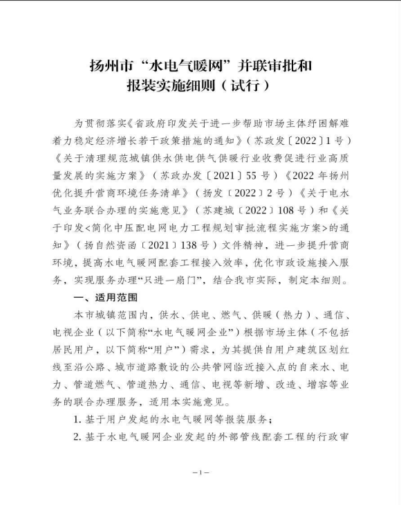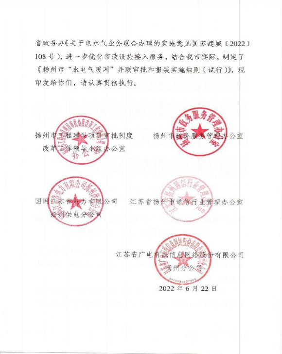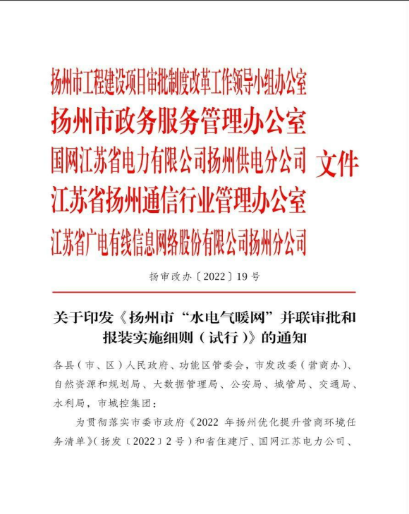 关于印发《 扬州市工程建设项目“水电气暖网”并联审批和报装实施细则(试行)》的通知(扬审改办〔2022〕19号)