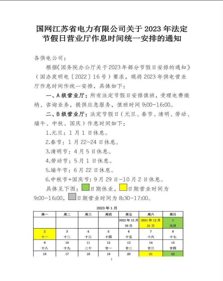 国网江苏省电力有限公司关于2023年法定节假日营业厅作息时间统一安排的通知
