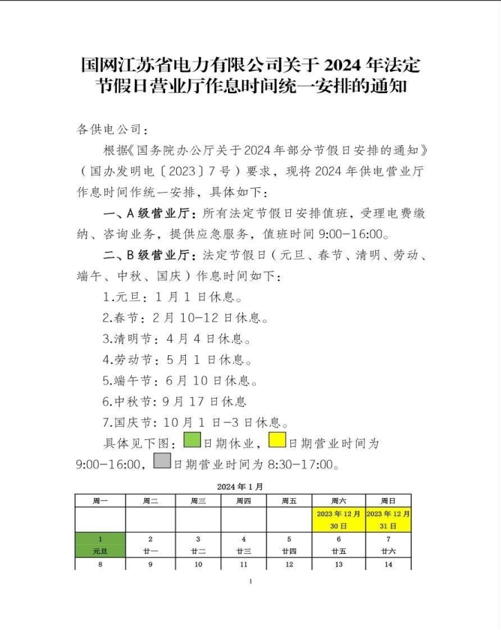 国网江苏省电力有限公司关于2024年法定节假日营业厅作息时间统一安排的通知