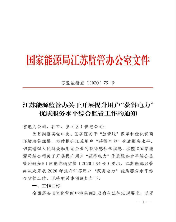 江苏能源监管办关于开展提升用户“获得电力“优质服务水平综合监管工作的通知(〔2020〕75 号)